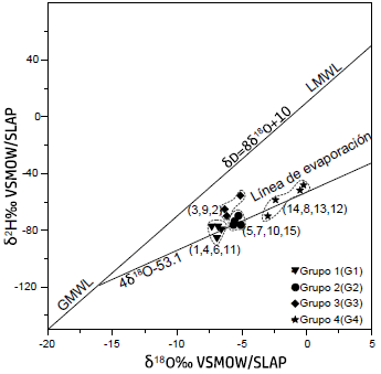 Las muestras del grupo 2 (G2), colectadas en el sitio 15 de la zona de recarga y en los sitios 5, 7, 10 de la zona de descarga, tienen valores isotópicos (δ18O -9.11 y δ2H -92.45, Figura 5) que indican una mayor evaporación que las del G1. Su firma isotópica es diferente a los grupos G1 (δ18O -10.20 y δ2H -97.15), G3 (δ18O -9.43 y δ2H-84.83) y G4 (δ18O -6.20 y δ2H -79.67), y sugiere otra ruta de circulación subterránea que conecta hidráulicamente las zonas de recarga-descarga.