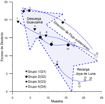Al grupo 1 (G1) corresponden las muestras colectadas en el sitio 11 de la zona de recarga y en los sitios 1, 4, 6 de la zona de descarga, siendo el grupo de menor evaporación (δ18O -10.20 y δ2H -97.15). Para este grupo, la muestra de la zona de recarga en Joya de Luna y el agua que emerge en la zona de descarga de Guaxcamá tienen una firma isotópica similar, lo cual refleja un proceso similar de fraccionamiento y de evaporación.