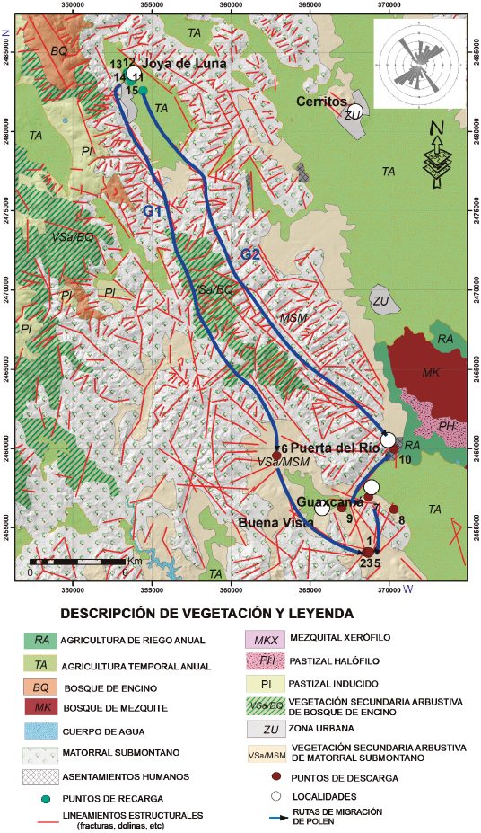 De las 41 especies polínicas caracterizadas en la región, en el periodo de agosto 2013 - junio 2016, solo 22 se identificaron en las muestras de agua subterránea de la zona de recarga y descarga. Los granos de polen coinciden con el periodo fenológico de las especies y los meses de cultivo; por ejemplo, para la especie Cicar la preparación del terreno es en primavera y se cosecha en octubre, los granos de polen de esta especie se encontraron en las muestras de agua subterránea de la zona de descarga colectadas en el mes de agosto 2013, octubre 2013 y abril 2014 (3, 6 y 10 meses después). La siembra del Zeama es en octubre y la cosecha en abril, los granos de polen se encuentran en agosto 2013, noviembre 2013, enero 2014 y febrero 2014 (4, 7 ,9 y 10 meses después). Después de la siembra del maíz se prepara el terreno para Avesa la cual se cosecha en primavera (marzo), los granos de esta especie se encuentran en agosto 2013, noviembre 2013 y febrero 2014 (5, 7 y 11 meses después). El Quercus sp. solo se encuentra en la zona montañosa y su tiempo de floración es en abril, los granos de esta misma especie se identificaron en las muestras de agua subterránea colectadas en la zona de descarga en el mes de octubre de 2013 y en enero de 2014 (6 y 9 meses después) (Tabla 3). Los granos de polen de cultivo y característicos de la zona de recarga se identificaron en la zona de descarga de seis a siete meses después, lo cual representa el tiempo aproximado de residencia del agua subterránea en el área de estudio (Tabla 3). Este tiempo de residencia de 6 a 7 meses sugiere que la velocidad promedio es de 124 a 145 m/día. Cuatro especies características y propias de la zona de recarga que se presentaron en la zona de descarga (Quercus sp., Avesa, Cicar, Zeama) fueron tomadas como trazador clave para establecer conexión entre las zonas de recarga y descarga, siguiendo el gradiente de vegetación con BQ, TA, RA, MSM y VSa/BQ (ver Figura 1). El utilizar granos de polen naturales como marcadores en estudios hidrogeológicos ha proporcionado resultados muy satisfactorios.