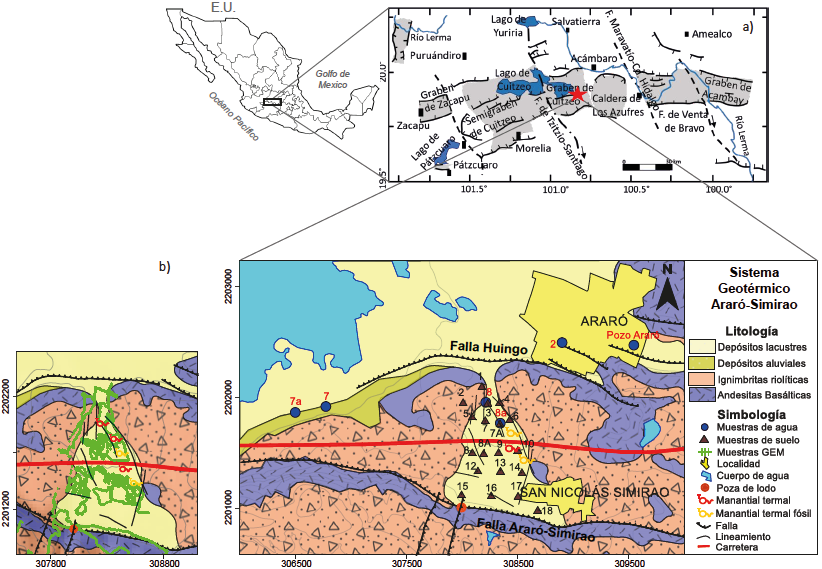 En el sistema geotérmico Araró-Simiro, las estructuras locales más importantes y aparentemente activas son las fallas de Huingo y Araró-Simirao (DETENAL, 1978), de tipo normal y orientación general ENW-WSE con variaciones en su rumbo a NE-SW y ENE-WSW (Figura 1a). A través de ellas afloran manifestaciones termales (Olvera-García et al., 2020). Estas estructuras configuran un sistema de bloques escalonados hacia el norte (y en menor grado hacia el noroeste), con ligeros basculamientos hacia el sur (y en menor grado hacia el sureste) (Viggiano-Guerra y Gutiérrez Negrín, 2003; Olvera-García et al., 2020). Las unidades volcánicas de base a techo incluyen: andesitas, andesitas basálticas, riolitas vítreas, riolitas vítreas con textura fluidal, ignimbritas riolíticas, basaltos y depósitos de escoria. Estas unidades se encuentran cubiertas por depósitos de talud, así como aluviones. En el área de estudio afloran tres unidades: andesitas basálticas, riolitas vítreas e ignimbritas riolíticas, además de depósitos aluviales (Figura 1) (Viggiano-Guerra y Gutiérrez Negrín, 2003; Viggiano-Guerra y Gutiérrez Negrín, 2005; Pola et al., 2016).