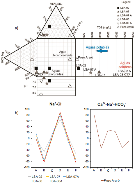 Figura 2 Diagramas de (a) Durov que muestra el tipo de agua de acuerdo con la concentración relativa de los iones mayoritarios y sus características fisicoquímicas (STD, CE y pH), y (b) D’Amore mostrando los dos tipos de agua, sódico-clorurada (Na+-Cl-) y bicarbonatada mixta (Ca2+-Na+-HCO3-), de acuerdo con su contexto geológico.