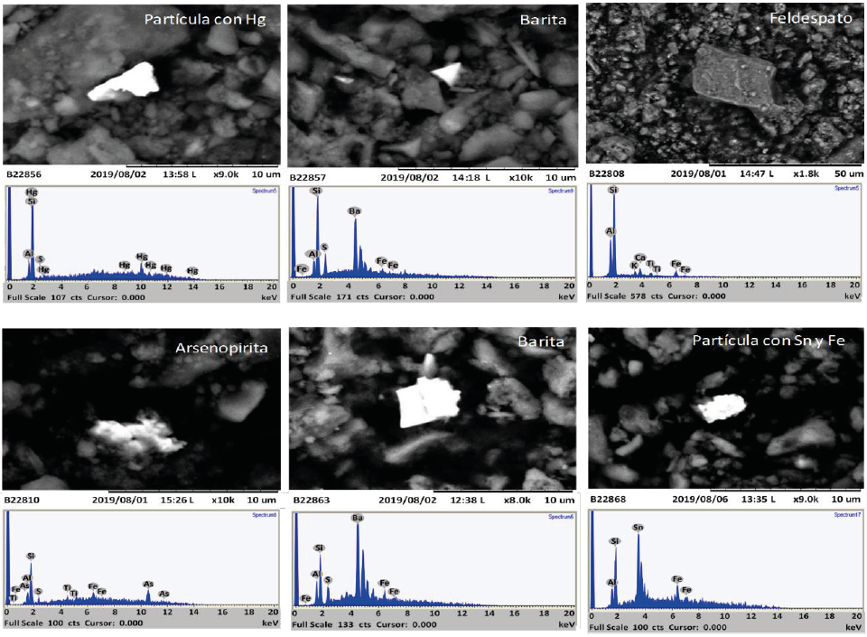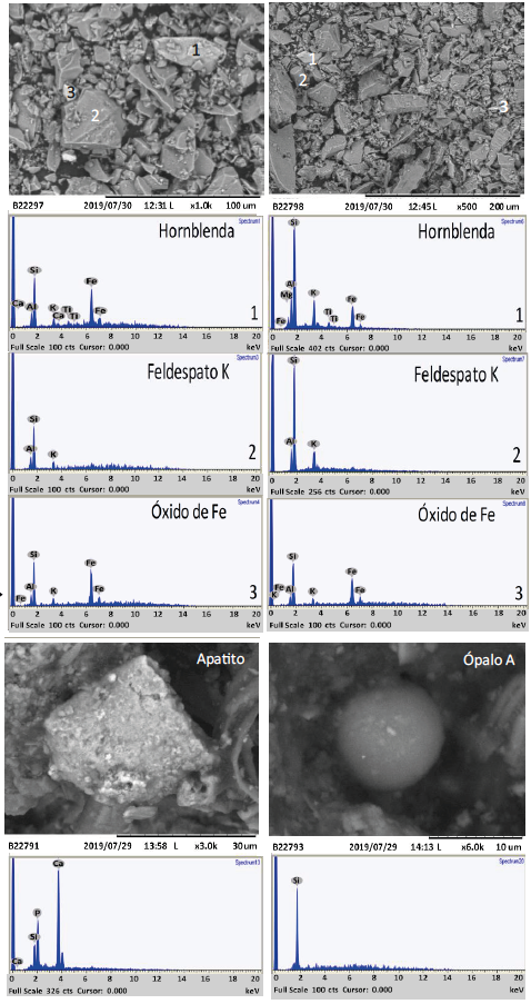 Además, se realizó el análisis mineralógico de 10 muestras seleccionadas de suelo, a través de microscopía electrónica y análisis de química mineral semicuantitativa, mediante un microscopio electrónico ambiental TM-1000 Hitachi con un detector acoplado de energía dispersiva de rayos X (EDX) del Laboratorio de Petrografía y Microtermometría de Inclusiones Fluidas del Instituto de Geofísica, UNAM. Para su análisis, las muestras fueron cuarteadas, tamizadas hasta malla 100 ASTM y colocadas entre dos portaobjetos de vidrio de dimensiones convencionales y recubiertas con grafito para la obtención de imágenes de electrones.