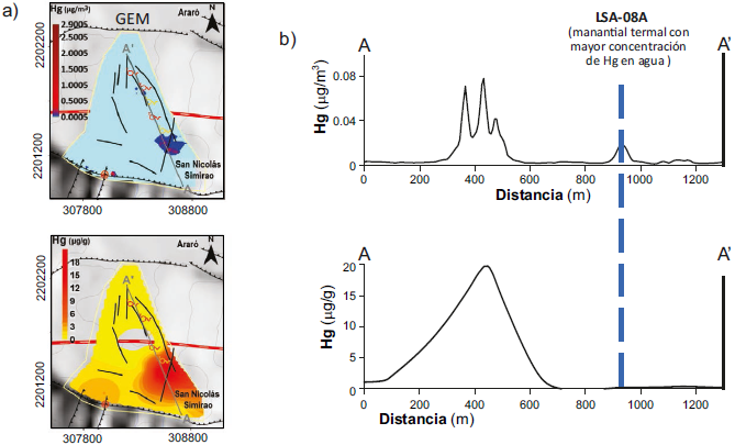 Figura 5 a) Mapa de distribución de la concentración en el aire de mercurio elemental gaseoso (GEM en μg/m3; modificado de Pérez-Martínez et al., 2021) y mapa de distribución de la concentración de Hg en suelos (en μg/g), de la zona geotérmica Araró-Simirao. La mayor parte del área de muestreo presenta valores de GEM por debajo del valor umbral (0.012 μg/m3, zona azul claro) determinado para la zona de estudio, pero arriba del límite de detección del equipo (0.0005 μg/m3); b) Perfiles de concentración de GEM en el aire y del Hg en suelos, a lo largo de la sección A-A’ mostrada en los mapas, junto con la ubicación del manantial termal con mayor contenido de Hg.