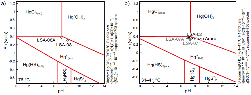 Figura 6 Diagramas de especies acuosas del mercurio. a) Para muestras de agua con temperatura a la descarga de 76° C y b) para muestras de agua con temperatura a la descarga de 31-41° C. Cada diagrama se realizó bajo las condiciones fisicoquímicas determinadas en campo, así como con las actividades calculadas a partir de las concentraciones analíticas cuantificadas en laboratorio.