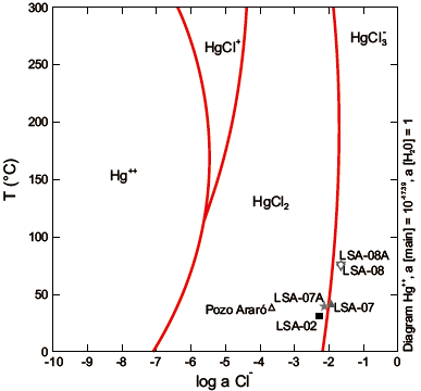 Figura 7 Diagrama del logartimo de la actividad de cloruros versus temperatura (°C) donde se muestra la especiación de los complejos clorurados del mercurio en las aguas termales. Se muestra la ubicación de las muestras de agua de Araró en los campos correspondientes a las especies HgCl2 y HgCl3-