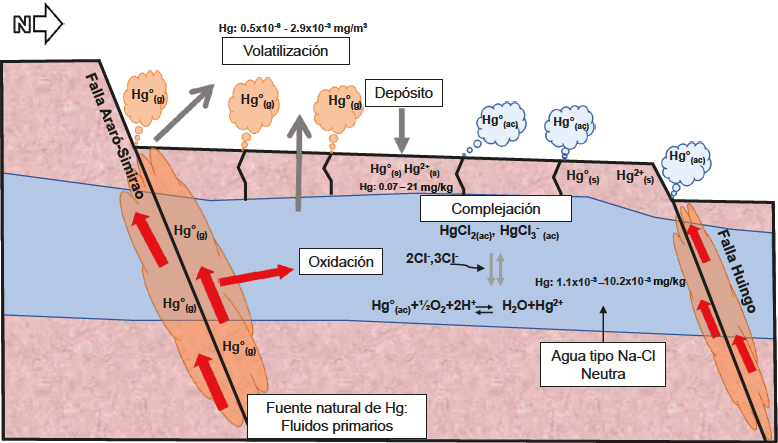 Cuando el fluido geotérmico junto con vapores de Hg0(g), probablemente derivados de magmas, llega al acuífero somero, éste se enriquece en Hg, debido a procesos de intercambio iónico y adsorción del vapor (Varekamp y Buseck, 1983). Este proceso se refleja en una mayor concentración de Hg en el agua de los manantiales calientes, como ocurre en el manantial de mayor temperatura (LSA-08A) de la zona (a excepción de la muestra LSA-08 con alta temperatura pero con bajo contenido de Hg, debido probablemente a la presencia de materia orgánica en el manantial). Dentro del acuífero, el Hg0(ac) sufre procesos de oxidación formándose el ión Hg2+. Las especies predominantes en la fase acuosa son el ion mercúrico (Hg2+) y Hg0(ac), los cuales provienen de la dismutación del ion mercuroso (Hg22+). El ion mercúrico forma complejos clorurados representados por las especies químicas: HgCl2 y HgCl3-, los cuales transportan al mercurio en la fase acuosa. Posteriormente, los complejos de Hg son transportados en la dirección de flujo del acuífero somero generando una aureola de anomalía de menor concentración alrededor de la zona de ascenso del agua caliente como sucede en la zona norte del sistema hidrotermal, derivado en parte de la volatilidad del Hg0(ac) al estar expuesto a la superficie. Finalmente en los manantiales de menor temperatura (LSA-02, Pozo Araró) queda solo el Hg remanente.