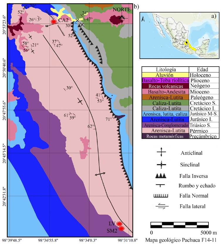 Figura 1 Mapa de ubicación de las zonas de estudio. a) Mapa de la República Mexicana mostrando en amarillo los estados de Hidalgo y Veracruz donde se ubican las zonas de estudio representadas con el punto negro. b) Mapa geológico donde se ubican las tres localidades estudiadas en este trabajo, CA2: Calnali 2; LV: La Virgen; SM2: San Mateo 2. Simbología: I) Inferior. M) Medio y S) Superior. Tomado y modificado de Velasco-de León et al. (2020).