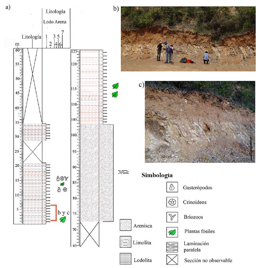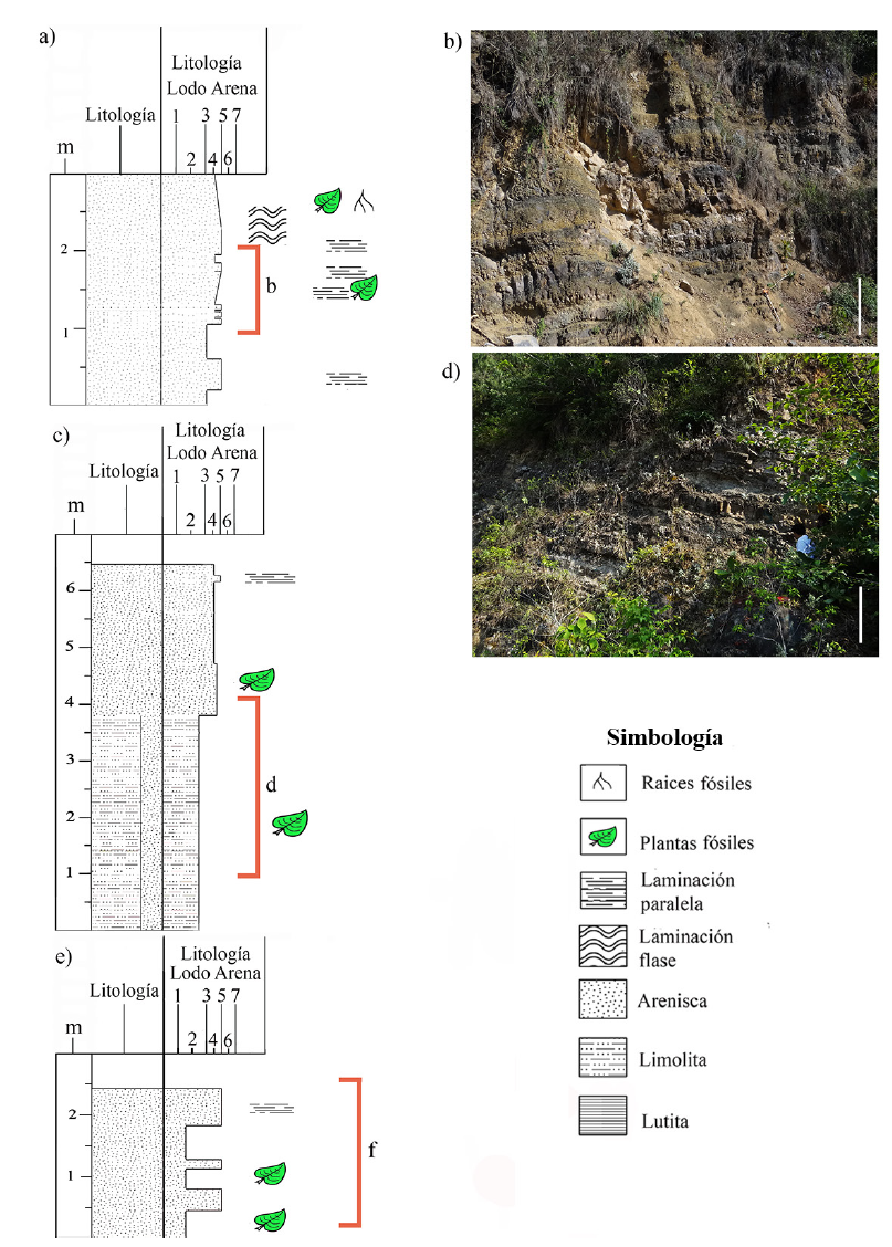 Con respecto a la localidad LV (Figura 3a-3b) se observa una secuencia de rocas de casi tres metros de espesor, a lo largo de la cual se ubican diferentes zonas con material fósil. En la base se observa una alternancia de lutita, limolita y arenisca de grano fino en estratos de 20 cm de espesor con laminación paralela; arriba de esta arenisca laminada se ubica un paquete de estratos delgados de arenisca de grano mediano con un espesor de 40 cm. Lo suprayace un paquete de rocas de 1 m de espesor, que en su base tiene capas onduladas de 3 a 7 cm de espesor con una gradación inversa de arenisca de grano fino-mediano. Posteriormente se ubica una arenisca de grano fino a mediano con laminación paralela. La cima de la sección estratigráfica mide unos 60 cm de espesor con arenisca muy fina-fina, con abundante flora fósil y con presencia de laminación tipo flaser (Figura 3b). Para esta localidad se ha propuesta un ambiente de depósito meramente continental a partir de las estructuras sedimentarias y su contenido fósil que es claramente autóctono (Velasco-de León et al., 2020).