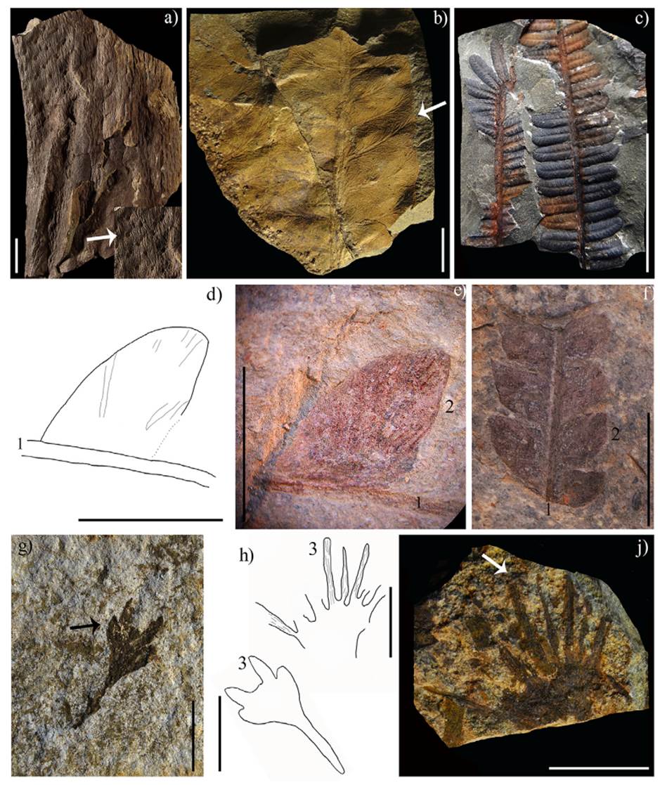 Figura 4 Macroflora del Paleozoico superior de México, Formación Tuzancoa. a) Corteza de Asolanus; la flecha indica la zona de inserción de las hojas. b) Hoja de Comia, la flecha indica la venación característica de este género. c) Pinna del género Asterotheca. e) Pínnula de la especie Odontopteris cf. O. brardii. d) Dibujo de la imagen e, donde se observa la venación típica de este género. f) Pinna incompleta de Odontopteris cf. O. brardii. g) Estructura reproductora de la familia Majonicaceae. h) Dibujos donde se observa el número variable de brácteas presentes en la famila Majonicaceae. j) Estructura femenina, donde la flecha indica la longitud de las bracteas. Simbología: 1) Raquis. 2) Margen. 3) Bracteas. Escala 1 cm.