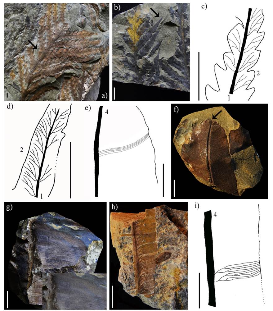 Figura 5 a) Fronda de Mariopteris la flecha indica una pínnula decurrente. b) Acercamiento de una pínnula de Mariopteris la flecha indica su ápice imparipinnado. c) Dibujo de una pínnula de Mariopteris aun sin fusionar. d) Dibujo de una pínnula de Mariopteris fusionada. e) Dibujo que muestra el margen y la venación de Taeniopteris feddeni. f) Hoja de Taeniopteris feddeni, donde se observa la forma de su ápice. g) Hoja incompleta de Taeniopteris feddeni de gran tamaño, además de un acercamiento a la venación. h) Foto de una hoja incompleta de Taeniopteris tenuis. i) Dibujo que muestra el margen y la venación de Taeniopteris tenuis. Simbología: 1) Raquis. 2) Margen. 4) Vena media. Escala 1 cm.