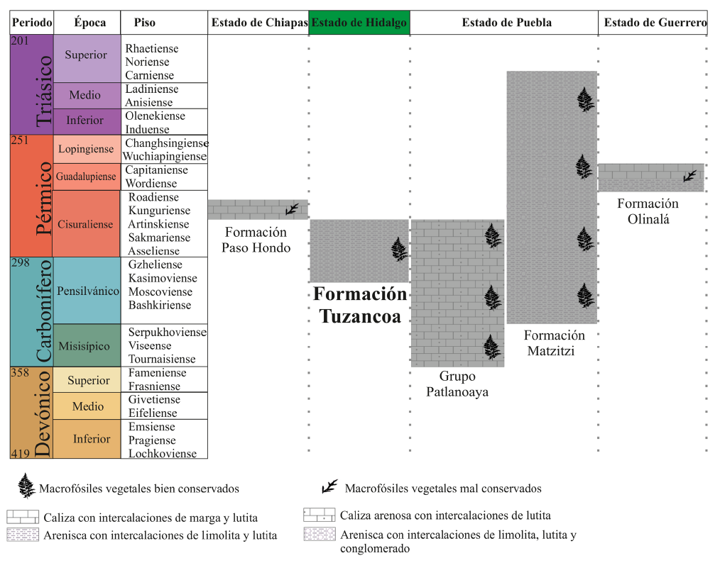La Formación Tuzancoa fue descrita anteriormente como perteneciente a la Formación Guacamaya (Carrillo-Bravo, 1965), para posteriormente ser propuesta como una unidad independiente (Rosales-Lagarde et al., 2005). Esta formación se describe como una secuencia siliciclástica con brechas andesíticas intercaladas con arenisca y lutita de origen volcánico, caracterizada por su registro fósil de bivalvos, crinoideos y foraminíferos. Todos estos datos indican un ambiente de depósito marino somero y transicional (Carrillo-Bravo, 1965; Rosales-Lagarde et al., 2005; Sour-Tovar et al., 2005; Quiroz-Barroso et al., 2012; Buitrón-Sánchez et al., 2017; Gutiérrez-Alejandre, 2018). Desde el punto de vista paleobotánico se tienen como antecedentes algunos trabajos taxonómicos (Silva-Pineda, 1963; 1987; Hernández-Castillo et al., 2014; Ortiz-Martínez y Velasco-de León, 2019; Velasco-de León et al., 2020). La sección tipo de esta formación aflora en las cercanías del poblado Otlamalacatla, Hidalgo (Rosales-Lagarde et al., 2005). En esta área y en la zona que comprende los poblados Calnali-Tlahuelompa se han realizado diversos estudios taxonómicos, cronológicos y biogeográficos sobre la fauna marina (Sour-Tovar et al., 2005; Quiroz-Barroso et al., 2012; Buitrón-Sánchez et al, 2017; Gutiérrez-Alejandre, 2018). El alcance estratigráfico de las especies de bivalvos, braquiópodos, gasterópodos y trilobites descritas para esta unidad han permitido asignar una edad de Pérmico temprano (Cisuraliense) y proponer una afinidad de esta fauna con la provincia Grandian de Norteamérica (Quiroz-Barroso et al., 2012).