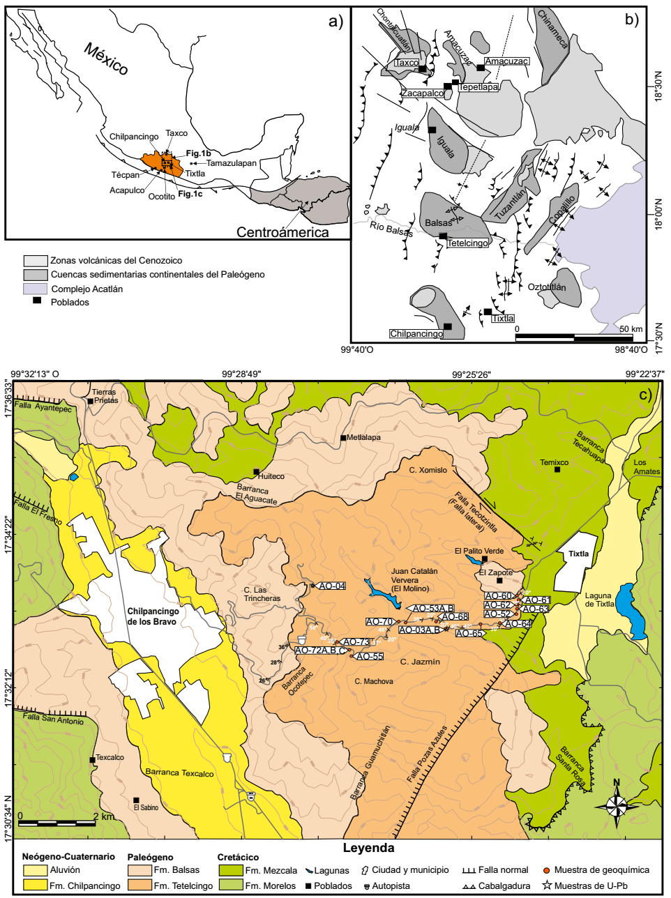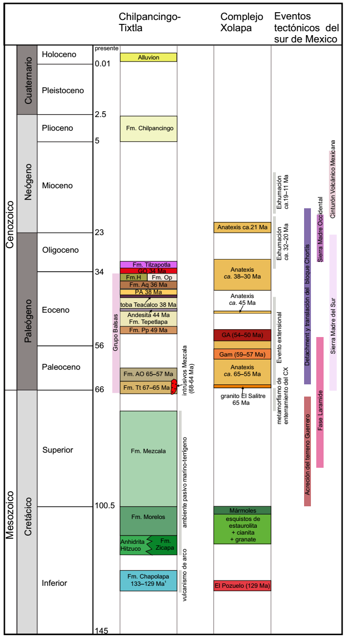 El sur de México está constituido por los terrenos Guerreo, Xolapa, Mixteca y Oaxaca (Campa y Coney, 1983). En la región comprendida entre Taxco y Chilpancingo, Guerrero, estos terrenos están cubiertos por secuencias volcano-sedimentarias del Cretácico Inferior (137-130 Ma) con metamorfismo de bajo grado (Esquisto Taxco, Roca Verde Taxco Viejo, y formaciones Chautla y Chapolapa; García-Díaz, 2004; Campa-Uranga et al., 2012, 2017). Sobre las unidades metamórficas previas, se depositaron rocas marinas del Albiano-Cenomaniano (formaciones Morelos, Zicapa y Cuautla, y Anhidrita Huitzuco) depositadas dentro de un ambiente de plataforma (De Cserna et al., 1980; Hernández-Romo et al., 1997). Estas unidades están sobreyacidas concordantemente por sucesiones de abanico submarino, deltaicas y de línea de costa del Cenomaniano-Santoniano de la Formación Mezcala (Fries, 1960; Aguilera-Franco y Hernández-Romano, 2004; Ocampo-Díaz y Guerrero-Suastegui, 2018). Estas unidades pre-paleogenas fueron deformadas durante la Orogenia Laramide (Cerca et al., 2007) ahora considerada como Orógeno Mexicano (Fitz-Díaz et al., 2018). Finalmente, sobre las unidades descritas anteriormente, se acumularon depósitos continentales volcánicos y sedimentarios del Paleógeno del GB en cuencas de la región norte y centro del estado de Guerrero (Ortega-Gutiérrez, 1980; Martínez-Paco, 2012; Figura 1b). El GB, en la región que comprende Taxco-Chilpancingo, Guerrero, está constituido por las formaciones Tetelcingo, Agua de Obispo, Papagayo, Alquitrán, Oapan, Tepetlapa, Huajintlán y Capas Zacango (e.g., Ortega-Gutiérrez, 1980; Campa-Uranga et al. 2002; Cerca et al., 2007; Morán-Zenteno et al., 2007; Meza-García et al., 2010; Martínez-Paco, 2012).