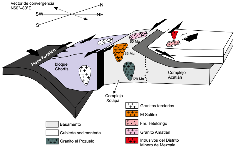 La mayoría de los modelos tectónicos para el límite Cretácico-Paleógeno del sur de México coinciden en que su complejidad tectónica se debe a una restructuración de la dinámica de placas que dio origen a la formación del Caribe (Rogers et al., 2007; Boschman et al., 2014). De acuerdo con nuestros datos de geocronología U-Pb, el inicio de la acumulación de la Formación Tetelcingo asignada al GB en el área de Chilpancingo-Tixtla, Guerreo, ocurrió en ~65 Ma y se traslapa en el tiempo con procesos de anatexis, detachment, extensión y magmatismo que ocurrieron al sur del área estudiada (Figura 9). En este sentido, se propone que la subducción de la placa de Farallón dio origen al vulcanismo en la parte superior de la corteza (Formación Tetelcingo)(Ortega-Gutiérrez, 1980; Cerca et al., 2007; Valencia-Moreno et al., 2021) y al emplazamiento de cuerpos plutónicos mineralizados en la parte intermedia de la corteza (intrusivos del Distrito Minero de Mezcala y Tecpan; Meza-Figueroa et al., 2003; Ferrari et al., 2014). Así mismo, en la región de Tierra Colorada, dentro del Complejo Xolapa se generó el emplazamiento del granito El Salitre (Sarmiento-Villagrana et al., 2022). Subsecuentemente, en la misma región ocurrió un proceso de extensión que generó magmatismo máfico y el detachment del bloque Chortís (García-Díaz, 2004; Talavera-Mendoza et al., 2018), proceso que generó metamorfismo/migmatizacion y el principal evento de exhumación de la parte norte del Complejo Xolapa (65-55Ma) (Talavera-Mendoza et al., 2013, 2018; Sarmiento-Villagrana et al., 2022). La exhumación del Complejo Xolapa favoreció la erosión de la parte superior de la corteza (cubierta del terreno Mixteca), dando origen al depósito de los conglomerados con clastos de calizas y lutitas intercaladas con las rocas volcánicas de la Formación Tetelcingo, depositadas en cuencas extensionales asociadas a fallas de deslizamiento lateral que se desarrollaron durante la traslación del bloque Chortís hacia el este (Alaniz-Álvarez et al., 2002; Cerca, 2004). Nosotros consideramos que el emplazamiento y depósito de las rocas de la Formación Tetelcingo en el área de estudio y rocas similares más jóvenes asignadas al GB que yacen a lo largo del límite norte del Complejo Xolapa (Conglomerado Tamazulapan; Cerca et al., 2007) ocurrieron en respuesta a la subducción de la Placa Farallón, seguido de extensión relacionada al desprendimiento y migración hacia el este del bloque Chortís y subsecuente exhumación (Figura 10). Estos procesos que ocurrieron en la parte norte, en la región de estudio, fueron trasladados hacia la parte sur, donde se depositó el Conglomerado Tamazulapan conforme se fue desplazando el bloque Chortís.