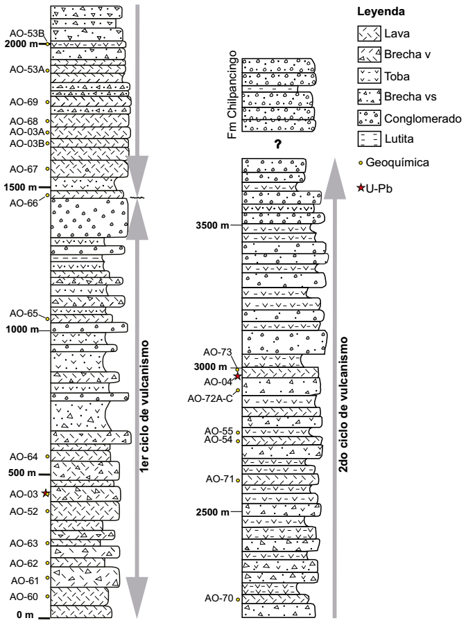 Figura 2 Sección estratigráfica de la Formación Tetelcingo del área de Chilpancingo-Tixtla, Guerrero, sur de México. En la sección se ubican las muestras para las que se obtuvieron análisis de geoquímica y geocronología U-Pb.