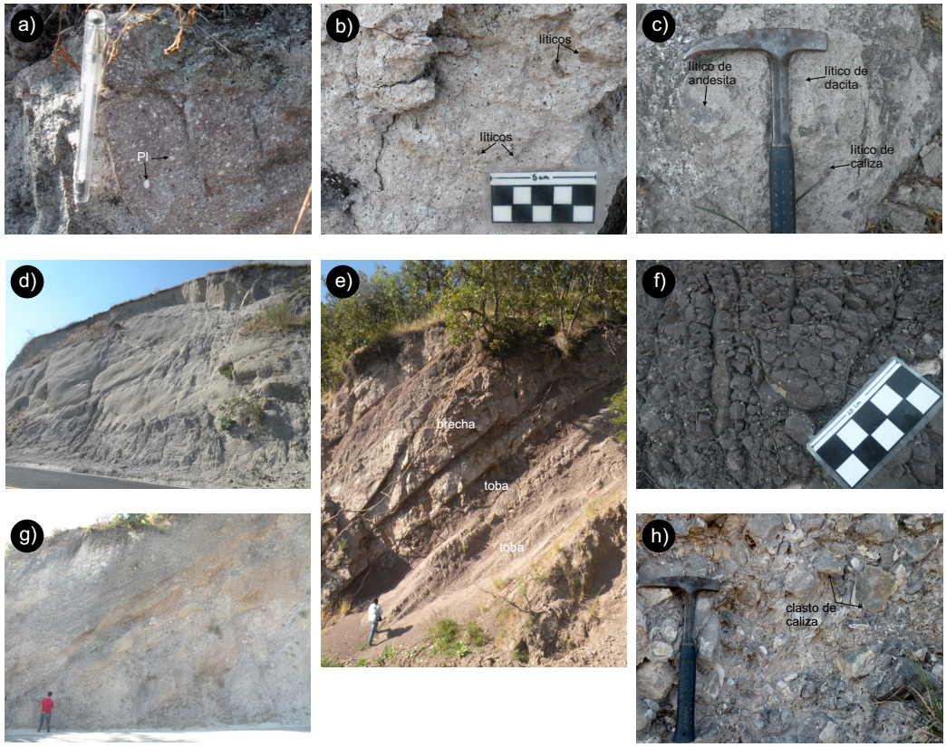 Figura 3 Fotografías de afloramiento de las distintas litologías de la Formación Tetelcingo del área de Chilpancingo-Tixtla, Guerrero, sur de México. a) Lavas andesíticas con textura porfídica (Pl: fenocistales de plagioclasa);.b) Lava dacítica con textura porfídica mostrando fenocristales de plagioclasa y fragmentos líticos. c) Brecha volcánica mostrando fragmentos angulosos de andesita, dacita y caliza. d) Tobas poco consolidadas. e) Alternancia de brechas y tobas volcánicas del segundo ciclo de vulcanismo. f) Lava con textura porfídica del segundo ciclo de vulcanismo. g) Toba gris del segundo ciclo de vulcanismo. y h) Conglomerado con abundantes fragmentos de caliza.