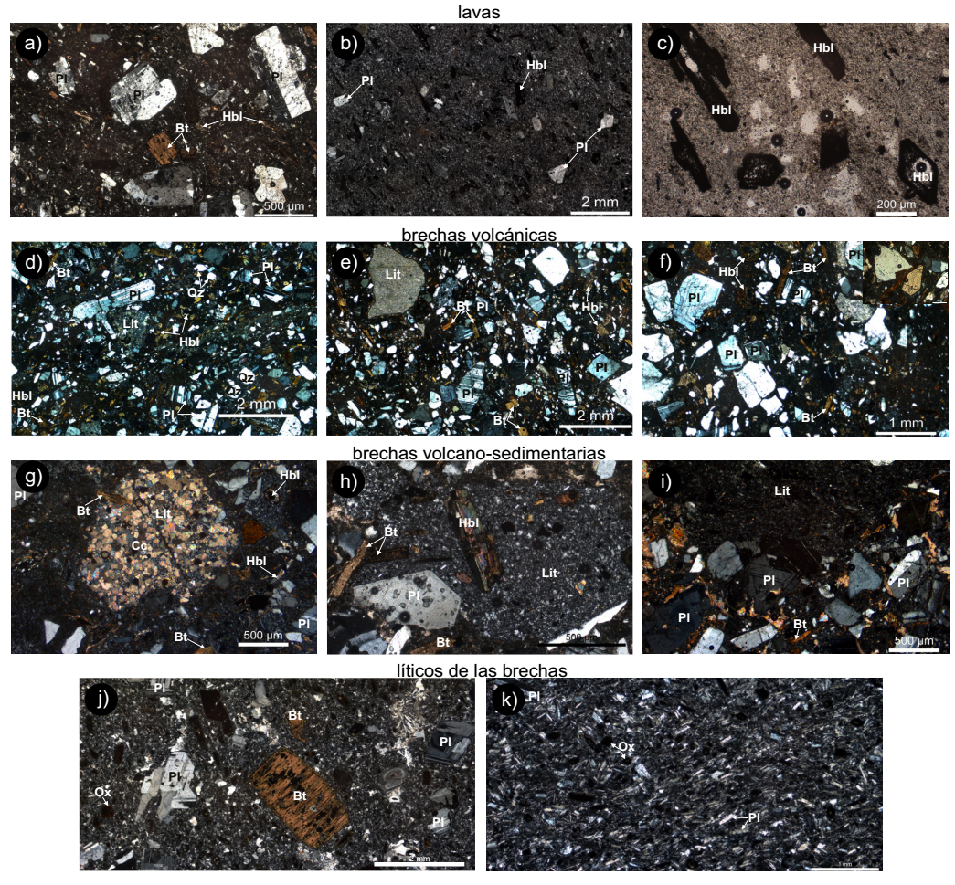 Figura 4 Fotomicrografías mostrando la mineralogía de las rocas volcánicas estudiadas de la Formación Tetelcingo del área Chilpancingo-Tixtla, Guerrero, sur de México. a-c) Lavas hipocristalinas con textura porfídica con fenocristales de biotita (Bt), hornblenda (Hbl) y plagioclasa (Pl). d-f) Lavas brechadas mostrando fragmentos de cuarzo (Qz) y escalos líticos de caliza (Lit). g-i) Brechas volcano-sedimentarias con parches de calcita (Cc). j-k) Líticos de las brechas volcano-sedimentarias.