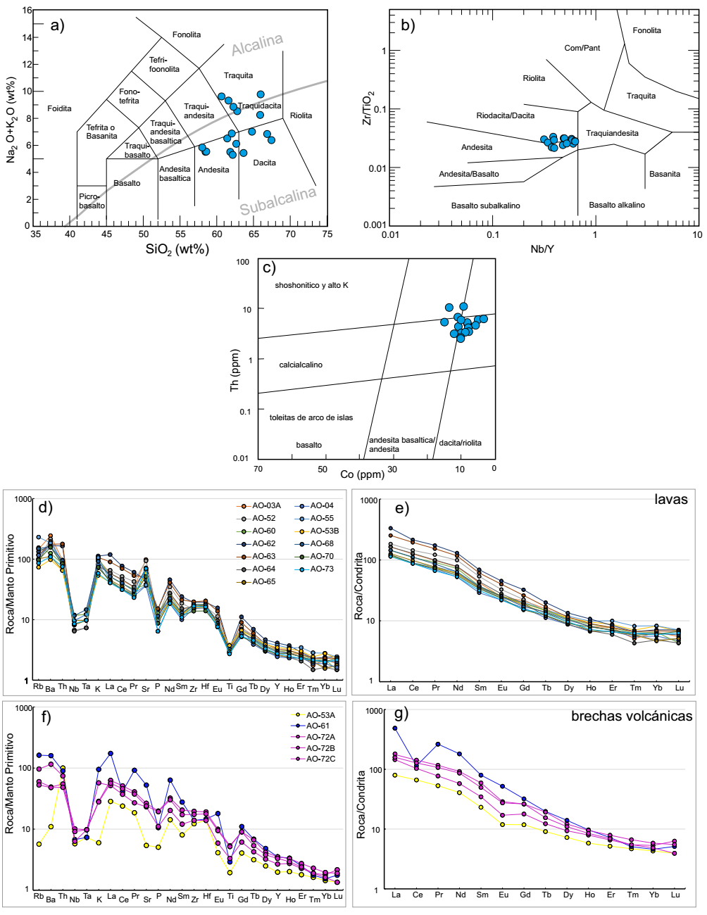 Figura 5 Diagramas de clasificación de las rocas volcánicas de la Formación Tetelcingo. a) Total Álcalis vs Sílice (TAS; Le Bas et al., 1986). b) Diagrama de Nb/Y vs. Zr/TiO2 (Winchester y Floyd, 1977). c) Diagrama de clasificación de Co vs. Th (Hastie et al., 2007). d-f) Diagrama multielemental normalizado a manto primitivo de Sun y McDonough (1989). e, g) Patrón de elementos de tierras raras (REE) normalizado a condrita de Evensen et al. (1978).