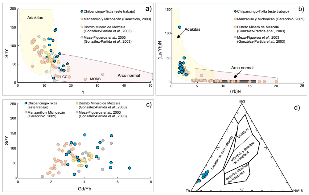 Figura 6 Diagramas de discriminación. a) Diagrama de Sr/Y vs. Y. b) (Yb)N vs. (La/Yb)N. c) Diagrama de Gd/Yb vs. Sr/Y. d) Th-Nb/16-Hf/3 (Wood, 1980); N: datos normalizados a valores del manto primitivo de Sun y McDonough (1989). En los diagrama a, b y c se hace una comparación de nuestros datos geoquímicos con los reportados por la literatura para rocas del Paleoceno.