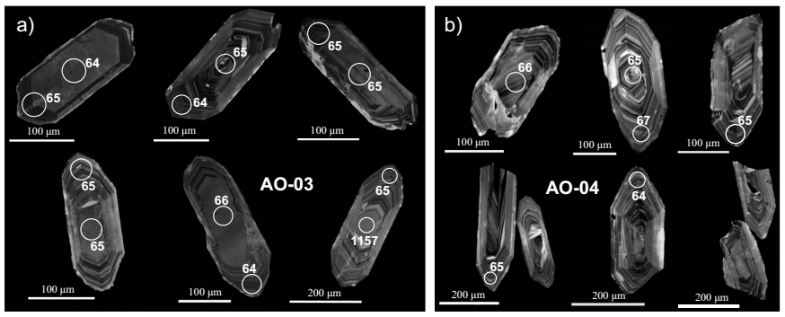 La muestra AO-04 es una dacita muestreada en la parte intermedia de la sección estratigráfica. De esta muestra se recuperaron escasos zircones y esfenas. Imágenes de CL de los zircones analizados muestran una forma bipiramidal y un tamaño que oscila entre 100 y 400 µm (Figura 7b). Los circones de la muestra AO-04 muestran un crecimiento oscilatorio y en menor medida, una estructura interna difusa. Las edades obtenidas de los zircones varían entre 67.1 ± 2.0 Ma y 64.5 ± 1.7 Ma (n = 5) con una edad de concordia de 65.26 ± 0.78 Ma (MSWD = 0.10) y, una edad media ponderada de 65.27 ± 1.9 Ma (MSWD = 1.2; Figura 8c). Los análisis de esfenas de la muestra AO-04A produjeron una edad de concordia de 64.8 ± 2.1 Ma (MSWD = 0.03) y una edad media ponderada de 64.9 ± 4.4 Ma (MSWD = 0.15; Figura 8d).