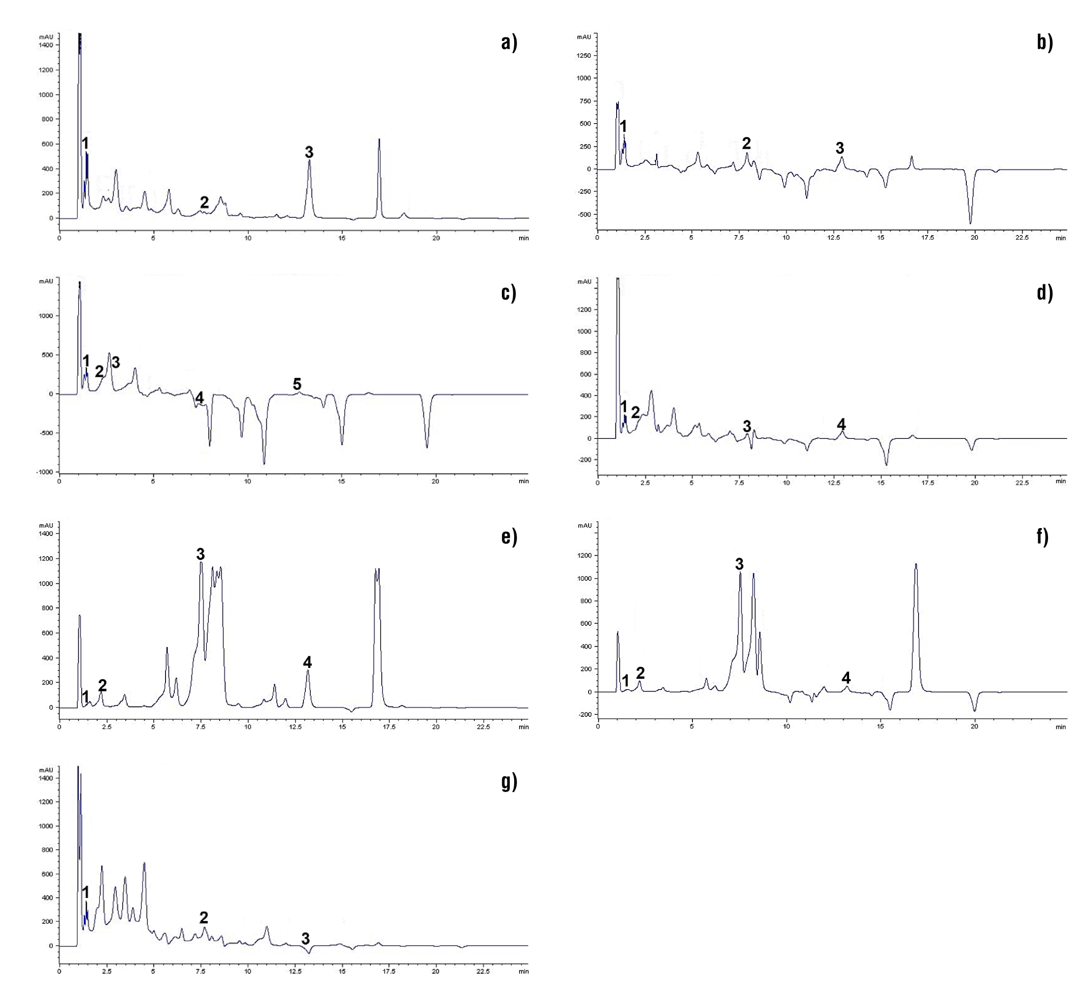 Figura 2 Perfil fenólico por HPLC de flores de D. x hortorum (detección a 254 nm): a) C1Va, b) C2Gui, c) C3Roj, d) C4Na, e) C5Ama, f) C6Fuc y g) C7Ros. Los datos de tiempo de retención se muestran en el Cuadro 2.