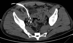 La tomografía de abdomen y pelvis con contraste iv demostró líquido libre en corredera parietocólica derecha, interasa y pericecal. Apéndice cecal con diámetro de 14 mm además de engrosamiento y realce de su pared. Colección supravesical con extensión a fosa iliaca derecha que mide 55 × 75 × 41 mm con un volumen calculado de 88 cm3 (Figura 1) y otra en fondo de saco con extensión a fosa iliaca izquierda que mide 60 × 57 × 70 mm con volumen de 125 cm3. Se decidió punción guiada por ultrasonido con control tomográfico de ambas colecciones (Figura 2), drenando 70 y 120 cm3 purulentos respectivamente. Se dejaron dos drenajes tipo Dawson Mueller® 10.2 fr, uno en fosa iliaca derecha y otro en fondo de saco. Se inició manejo antimicrobiano de amplio espectro con meropenem 1 g iv cada ocho horas y vancomicina 1 g iv cada 12 horas, se dejó en ayuno dos días y se inició apoyo nutricional parenteral durante tres días con oliclinomel®. El cultivo aeróbico desarrolló Streptococcus constellatus sensible a ertapenem, por lo que se cambió cobertura antimicrobiana a base de ertapenem 1 g iv cada 24 horas y vancomicina. El paciente se mantuvo clínicamente estable, sin datos de respuesta inflamatoria sistémica y disminución progresiva del dolor abdominal. Una TAC de control en su tercer día (Figura 3) demostró una disminución importante del líquido en el interior de las colecciones. Se retiró el drenaje derecho en su cuarto día, con un gasto total de 10 cm3; los marcadores inflamatorios presentaron una disminución progresiva durante su estancia, egresándose con 9.9 10^3/μl leucocitos, seg 67%, bandas 0 % y PCR 4.05 mg/dl. Se retiró el drenaje izquierdo previo a su egreso en el noveno día de estancia con un gasto total de 82 cm3. No se realizó apendicectomía de intervalo en el seguimiento debido a que, basado en la edad, los antecedentes y los estudios de imagen al diagnóstico, la probabilidad de neoplasia se consideró baja de acuerdo a las recomendaciones existentes en la literatura.