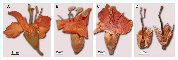 Fig. 3 Detalles de flores herborizadas de especies del grupo Bourreria spathulata. A, B. rubra; B, B. spathulata; C, B. ritovegana; D, B. spathulata (izq.) y B. ritovegana (der.). Fotografías de María Guadalupe Chávez Hernández (A) y Juan Fernando Pío León (B-D).
