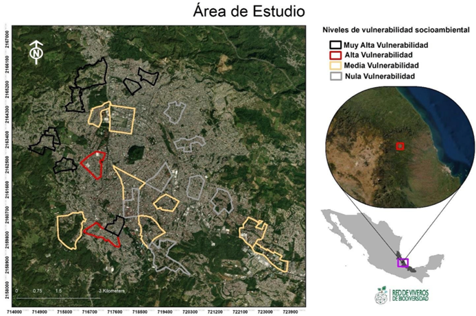 El estudio se llevó a cabo en la ciudad de Xalapa, Veracruz, una ciudad con una población de 480,841 habitantes, lo que representa el 6.15% de la población del estado. La zona urbana abarca una superficie de 64 km2, con un rango altitudinal que varía entre 1,100 y 1,600 m. Su clima es semicálido húmedo con lluvias abundantes en verano al sureste y templado húmedo con lluvias todo el año al noroeste. La precipitación media anual es de 1368.2 mm. La temperatura media anual oscila entre 18-24°C. La vegetación natural predominante corresponde al bosque mesófilo de montaña. Las áreas urbanas se encuentran en lomerío de basalto y sierra volcánica, con suelos dominantes de Andosol y Regosol, que anteriormente estaban ocupados por agricultura, bosques y pastizales (Castillo-Campos, 1991) (Gómez-Columna & Soto-Esparza, 1993) (Instituto Nacional de Estadística, Geografía e Informática (INEGI), 2009)