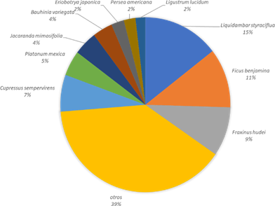 Con las variables medidas en campo y mediante la aplicación del programa i Tree Eco v6 se estimó que el arbolado de los ejes viales estudiados cubre una superficie total de 6.75 hectáreas y proporciona 17.01 hectáreas de área foliar, reflejando una amplia distribución entre las zonas analizadas. Las especies dominantes en términos de área foliar son L. styraciflua, F. uhdei y F. benjamina. Las cinco especies más comunes fueron: L. styraciflua, F. benjamina, F. uhdei, C. sempervirens y P. mexicana (Figura 2).
