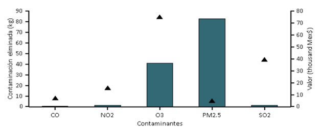 Figura 3 Eliminación anual de contaminantes por el arbolado de alineación de la ciudad de Xalapa, Veracruz, y valor económico de este servicio ecosistémico. En el eje X se encuentran los tipos de contaminantes, en el eje Y izquierdo, las barras representan la cantidad de contaminación eliminada (kg), mientras que, en el eje Y derecho, los triángulos representan el valor económico por la eliminación de cada contaminante.