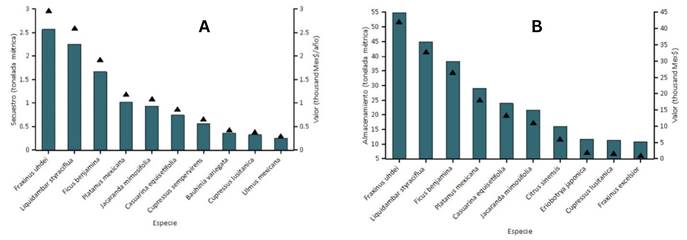 Figura 4 Captura y almacenamiento de carbono por las principales especies del arbolado de alineación de la ciudad de Xalapa, Veracruz. Panel A Captura anual de carbono en toneladas métricas (barras) y su valor económico asociado en miles de MXN (triángulos). Panel B Almacenamiento total de carbono en toneladas métricas (barras) y su valor económico asociado en miles de MXN (triángulos). Las especies están ordenadas en cada panel de acuerdo con la cantidad de carbono secuestrado o almacenado.