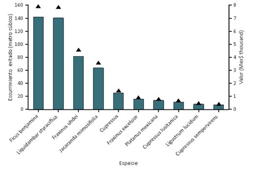 Figura 5 Escurrimiento de agua evitado por las principales especies del arbolado de alineación de la ciudad de Xalapa, Veracruz. Las especies están ordenadas de manera descendente según el volumen de escurrimiento evitado (m³), representado por las barras. Los triángulos indican el valor económico correspondiente (en miles de MXN) por el escurrimiento evitado para cada especie.