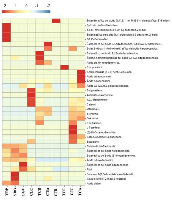La distribución de 36 compuestos determinados por GC-MS varió entre extractos (Figura 2). El extracto YRP mostró mayor concentración de los compuestos epóxido de cis-Z-α-Bisaboleno; 8S,13-cedran diol; éster metílico del ácido [1,1'-biciclopropil]-2-octanoico, 2'-hexil y 4,4,8-trimetiltriciclo [6.3.1.0(1,5)] dodecano-2,9-diol. El extracto YBG tuvo altas concentraciones de trans-6-(p-tolil)-2-metil-2-heptenol; benceno 1-(1,5-dimetil-4-hexenil)-4-metil, seguido de ácido oleico y éster etílico del ácido hexadecanoico. El extracto OGV tuvo altas concentraciones de éster etílico del ácido octadecanoico seguido de fitol. El extracto CJC tuvo como compuestos mayoritarios a γ-Tocoferol y (Z)-18-Octadec-9-enolida, seguidos de escualeno y 3-etil-5-(2-etilbutil)-octadecano. Similarmente en el extracto TCA se encontró como compuestos mayoritarios el ácido tetradecanoico; 6-Metilenebicyclo [3.2.0] hept-3-en-2-ona; ácido octadecanoico, seguido del ácido 9Z,12Z,15Z-octadecatrienoico. El extracto CLC mostró como compuestos mayoritarios al estigmasterol y anhídrido cis-aconítico, seguidos de 1,2,3-bencenetriol y catecol. En el extracto CJR, el compuesto más abundante fue éster dimetílico del ácido [1,1':2',1''-terfenil]-3',4'-dicarboxilico, 5',6'-difenil. El extracto TCC tuvo como compuesto mayoritario al éster terc-butílico de [5-(5-Cloro-3,4-dimetil-1H-pirrol-2-ilmetilen)-,4-dimetil-5H-pirrol-2-il]-[5-(5-ciano-4,4,5-trimetil-4,5-dihidro-3H-pirrol-2-ilmetileno)- 4, 4-dimetilpirrolidin-2-ilen]-ácido acético. El extracto CTia tuvo como compuestos mayoritarios al éster etílico 2-hidroxi-1-(hidroximetil) del ácido 9Z-octadecenoico y éster etílico del ácido hexadecanoico 2-hidroxi-1-(hidroximetil). En el extracto TCB los compuestos mayoritarios fueron éster etílico del ácido 9,12-octadecadienoico; 2,3-dihidroxipropil éster del ácido 9Z,12Z-octadecadienoico y el ácido cis-10-nonadecenoico (Figura 2).