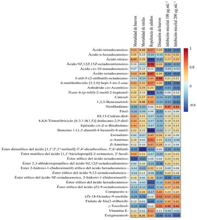 Se determinó la correlación entre la actividad biológica y la abundancia relativa de compuestos en los extractos (Figura 3), con variación de coloración azul a rojo, ubicando las correlaciones positivas como aquellas donde la mayor abundancia de los compuestos produjo mayor efecto. Para el caso de la mortalidad de B. tabaci, se observó que la mayor mortalidad de huevos y ninfas estuvo asociada a la alta abundancia de ácido oleico y 1,2,3-bencenetriol en los EEs, respectivamente. Se observó correlación positiva entre la repelencia de adultos y la abundancia del ácido 9Z-12Z-15Z-octadecanotrienoico y el ácido octadecanoico, en la disuasión de oviposición la correlación fue con el compuesto de 3-etil-5-(2-etilbutil)-octadecano. El mayor porcentaje de ICM en F. oxysporum se observó correlacionado con altas concentraciones del compuesto neofitadieno en los EEs.