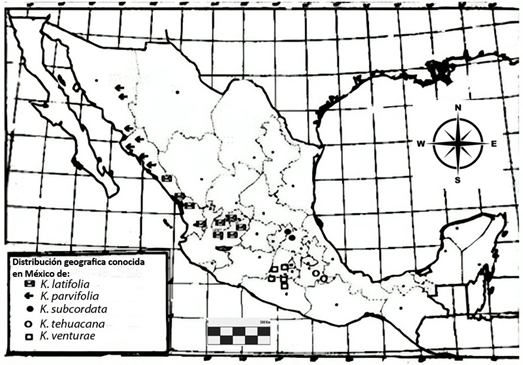 Figura 13 Distribución geográfica conocida en México de: K. latifolia, K. parvifolia, K. subcordata, K. tehuacana y K. venturae.