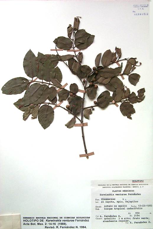 KARWINSKIA VENTURAE R. Fernández. Acta Bot. Mex. 2:14‐16. 1988. Tipo: México, Estado de México, El Zapote, Mpio. Tejupilco, R. Fernández N. 3184 (holotipo: ENCB!; isotipos: CHAPA!, GH!. MEXU!, NY!, TEX!). Figura 14.