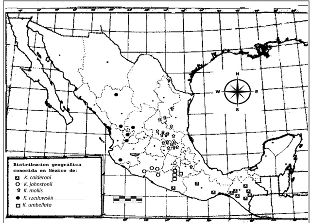 Figura 2 Distribución geográfica conocida en México de: K. calderoni, K. johnstonii, K. mollis, K. rzedowskii y K. umbellata.