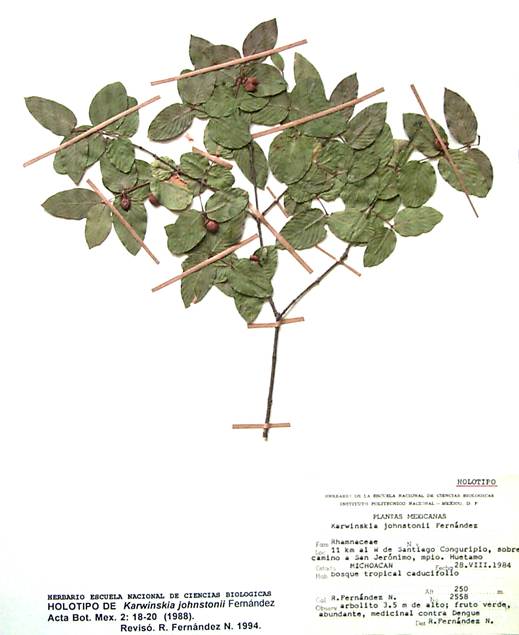 KARWINSKIA JOHNSTONII R. Fernández, Acta Bot. Mex. 2:18‐20.1988. Tipo: México. Michoacán. 11 km al W de Santiago Conguripio, Mpio. de Huetamo, R. Fernández N. 2558 (holotipo: ENCB!, isotipos: CHAPA!, MEXU!, TEX!, XAL!, US!). Figura 5.