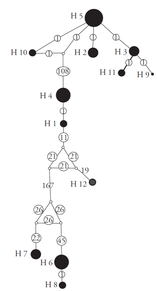In Figure 2, each haplotype is represented by a black circle the size of which is proportional to the frequency of the sequences that it is made up by. Mean vectors are represented in white and were generated by the software to link distant haplotypes. Mean vectors can be mutational steps, extinct, or not sampled subspecies. The analysis detected three major haplotype groups: 1) haplotypes 1 and 4, which are 51 mutational steps away from Lennoa (H12); 2) a group formed by haplotypes 2, 3, 5, 9, 10 and 11 is 160 steps away ; and 3) another group formed by haplotypes 6, 7 and 8 is 207 steps away. The methods used in haplotype networks are designed to model the evolutionary past via a stochastic process (coalescence), which is based on the idea that the alleles in a population can be traced back in time to the point where they coalesce with an ancestral allele. Therefore, the haplotypes furthest from the root sequence (6, 7, 8, 3, 11 y 9) are the most recent and the haplotypes closest to the root sequence (1 and 4) are the oldest (Eguiarte et al., 2007).