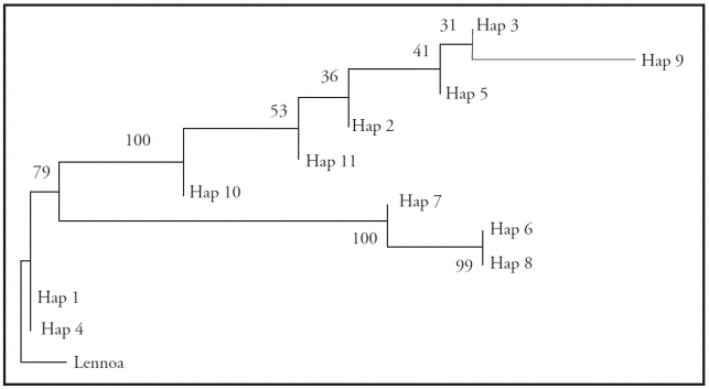 The phylogenetic tree of the 11 haplotypes showed four groups: 1) the outgroup group (Lennoa); 2) haplotypes 1 and 4, as the basal group of P. culiacanum and the closest to Lennoa; 3) a branch which bifurcates into two major groups (80 % support), on the one hand, haplotypes close to the basal group 6, 8 and 7 (100 % support); and (4) a branch (100 % support) with haplotypes 2, 3, 5, 9, 10, 11. The general distribution matched the haplotype network diagram, including the proximity or distance from the root sequences (Figure 3).