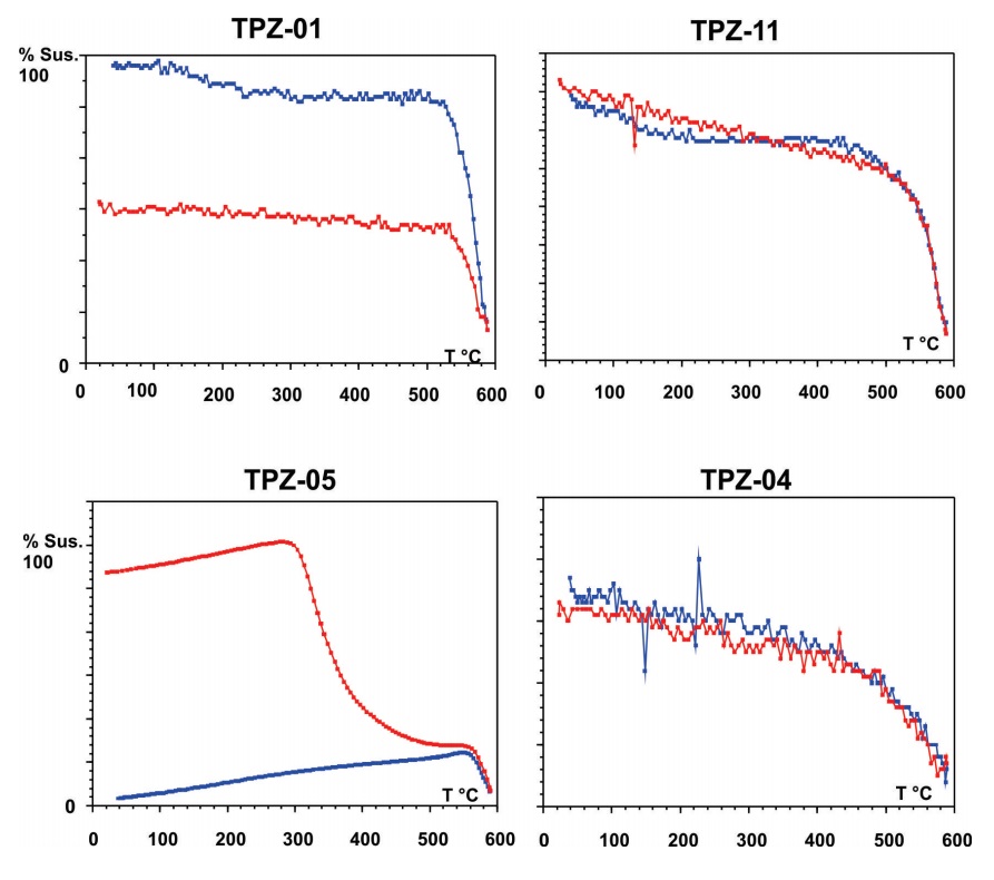 C) En dos muestras, se observan dos fases ferromagnéticas durante el calentamiento (Figura 2, TPZ-05). La primera de ellas es más significativa con una temperatura de Curie de 340°C y la segunda a una temperatura de 560°C; este comportamiento se debe posiblemente a la coexistencia de titanomaghemitas y titanomagnetitas. Durante el enfriamiento, se observa una sola fase magnética y una disminución considerable en el valor inicial de la susceptibilidad (Figura 2, TPZ-05).