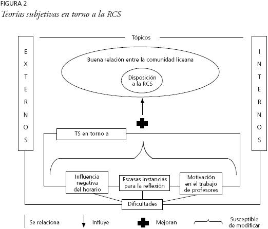 La figura está organizada en relación con tópicos considerados externos al grupo de profesores, por tanto de menor percepción de controlabilidad, y otros internos. A su vez las teorías subjetivas de los docentes, ya descritas en la primera parte de estos resultados, son presentadas aquí en una relación de posible mejoría de la disposición a la RCS, en la medida que son identificadas como explicaciones sobre dificultades susceptibles de modificar por parte del grupo.