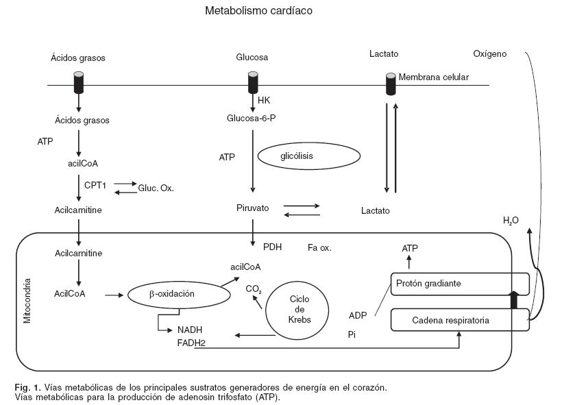 El corazón puede utilizar muchos sustratos para su "metabolismo energético". Este término puede ser usado como sinónimo de "bioquímica del corazón" y se refiere a un gran número de reacciones catalizadas por enzimas interrelacionadas, que son responsables del control de la transferencia de energía en el corazón. El miocito cardíaco puede utilizar ácidos grasos libres, glucosa, lactato, piruvato, acetato, cuerpos cetónicos, y aminoácidos. La absorción y utilización de un sustrato en particular es proporcional a su concentración arterial. En condiciones aeróbicas normales, los ácidos grasos libres son el sustrato de elección y aportan el 60% de los requerimientos energéticos gracias a su metabolismo oxidativo por la vía del ciclo de Krebs y no son extraídos por el miocardio si la concentración es inferior a 350 micromoles por litro. El metabolismo de los carbohidratos aporta el 30 a 40% de los requerimientos, pero estos porcentajes se pueden elevar cuando las necesidades metabólicas aumentan y durante la isquemia o cuando la concentración de ácidos grasos es baja. La glucosa es transformada en piruvato (glucólisis anaeróbica) y éste es oxidado a dióxido de carbono y agua a través del ciclo de Krebs para producir adenosintrifosfato (ATP). El miocardio extrae normalmente 20% de lactato de la sangre arterial, pero durante la isquemia se estimula la actividad glucolítica y el corazón se convierte en productor de lactato. Durante la isquemia miocárdica se encuentran restringidos el aporte de oxígeno y la disponibilidad de los sustratos. En el individuo sano, la concentración de glucosa en la sangre varía entre 3 y 6 mM (70–110 mg/ 100 mL), los ácidos grasos libres entre 0.2 y 0.6 mM y 1.0 mM de lactato. Sin embargo, cuando los niveles de ácido láctico aumentan a valores cercanos a 10 mM, por ejemplo durante la realización de ejercicio intenso, la oxidación de lactato provee hasta el 60% del ATP requerido para cubrir las demandas energéticas del corazón. Durante el ayuno prolongado, la oxidación de cuerpos cetónicos provee la mayor parte del ATP, ya que los niveles de estos sustratos aumentan significativamente. Sin embargo, en el preoperatorio pueden ocurrir considerables cambios en la concentración de los sustratos como consecuencia de los protocolos de ayuno preoperatorio. Los pacientes programados para cirugía cardíaca usualmente tienen ayunos de 8 a 12 horas y esto puede causar concentraciones bajas de insulina y concentraciones altas de ácidos grasos libres.28,29