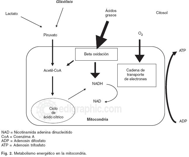 Los ácidos grasos (AG) suplen aproximadamente el 60 al 90% de la energía usada para sintetizar ATP en el corazón humano normal.3 La cantidad de captación de ácidos grasos por el corazón está determinada principalmente por su concentración en el plasma,4 la que puede variar entre 0.1 y 1.5 mM aproximadamente. Los ácidos grasos utilizados por el corazón se encuentran en forma no esterificada (ácidos grasos libres), asociados a la albúmina plasmática, provenientes de la lipólisis en el tejido adiposo o se forman por la hidrólisis de los triglicéridos circulantes. Se ha descrito la posibilidad de la existencia de dos vías distintas de transporte de los ácidos grasos: la vía pasiva que consiste en el transporte de los AG por simple difusión a través de la membrana y la vía activa por medio de las proteínas transportadoras de ácidos grasos, como la translocasa de ácidos grasos (FAT por sus siglas en inglés). La translocasa de ácidos grasos (FAT/ CD36) es una proteína que se expresa de manera abundante en los tejidos con alta actividad metabólica de ácidos grasos como en el corazón y tiene un papel importante en la producción de energía. El amplio margen de concentración de los ácidos grasos en el plasma, se debe al control hormonal por la insulina y la noradrenalina en los tejidos. La insulina baja los niveles de ácidos grasos, por ejemplo en el período postprandial. Por otro lado, la noradrenalina aumenta la liberación de ácidos grasos, por ejemplo durante el estrés, como el ejercicio físico, el ayuno, o en la isquemia miocárdica. Los pacientes diabéticos tienen niveles altos de ácidos grasos debido a insulina baja y/o resistencia a la insulina. Los ácidos grasos son oxidados en las mitocondrias, en donde liberan energía en forma de nicotinamida–adenina dinucleótido (NADH) y flavina–adenina–di nucleótido reducido (FADH2) por la cadena de transporte de electrones y la formación subsiguiente de ATP por la fosforilación oxidativa (Fig. 2).5 Una vez en la célula, los ácidos grasos son esterificados a acetilcoenzima A (CoA) por la acilCoA sintetasa y en las mitocondrias entran en la cascada de la beta–oxidación. El proceso de la beta–oxidación consiste en la eliminación secuencial de una molécula de dos carbonos por oxidación del carbono en la posición beta de la molécula acilCoA. Para atravesar la membrana mitocondrial los ácidos grasos deben ser convertidos en acilcarnitinapor la enzima carnitina–palmitil–transferasa (CPT).