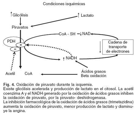La oxidación de glucosa y lactato puede ser inhibida por la oxidación de ácidos grasos en el corazón.6 El aumento de concentración de ácidos grasos en el plasma puede ser inhibido por medios farmacológicos, por ejemplo con la niacina,7 o inhibiendo directamente la oxidación de ácidos grasos en las mitocondrias, por ejemplo con inhibidor de carnitina–palmitina–transferasa,8 o con trimetazidina que es un inhibidor de 3 ketoaciltiolasa (3KAT),9 con lo que se puede producir un aumento en la captación y oxidación de glucosa y/o lactato. Estudios en humanos han demostrado que la inhibición farmacológica del grado de oxidación de ácidos grasos por el corazón acelera el flujo de piruvato a través de la piruvato deshidrogenasa (PDH) y la captación de glucosa y lactato por el corazón.10