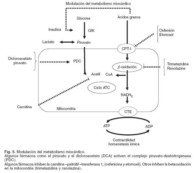 Existen diferentes métodos para manipular el metabolismo energético del corazón: uno es aumentando la captación de glucosa y disminuyendo los niveles de ácidos grasos circulantes con el uso de infusión de glucosa e insulina.50 Otra forma de aumentar el metabolismo de la glucosa es estimulando la oxidación de glucosa miocárdica por aumento directo de la actividad de la piruvato deshidrogenasa (PDH), o indirectamente estimulando la PDH por inhibición de la oxidación de ácidos grasos. Los fármacos que aumentan la oxidación de glucosa son: Dicloroacetato, ranolazine, trimetazidine, L–carnitina y propionil L–carnitina.