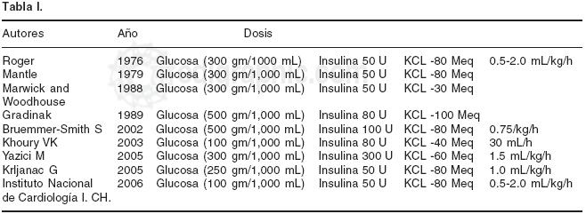 La disfunción ventricular izquierda es la principal determinante de los resultados en los pacientes coronarios sometidos a cirugía cardíaca. Ésta puede ser causada por miocardio contundido o corazón hibernante. Preservar el metabolismo a pesar de una función disminuida es la piedra angular en el miocardio viable, pero algunas alteraciones han sido documentadas en dicho tejido, como los cambios estructurales, la pérdida del retículo sarcoplásmico, mitocondrias pequeñas y dispersas y depósito de glicógeno. Estos cambios sugieren una disminución en el metabolismo aeróbico, pero la captación y la utilización de glucosa están preservadas y de hecho han sido usadas como marcadores diagnósticos de viabilidad miocárdica. La infusión de glucosa–insulina–potasio ha demostrado que disminuye la lesión isquémica, mejora la disfunción ventricular post–isquémica, y reduce la mortalidad de manera similar al tratamiento trombolítico en pacientes infartados. En un estudio de 30 pacientes con infarto del miocardio previo, anormalidades de la movilidad de la pared del ventrículo izquierdo y disfunción ventricular, se les efectuó ecocardiografía de estrés con dobutamina y 4 horas de infusión con GIK (Dextrosa al 10% 1.000 mL, Insulina 80 U, KCL 40 mEq, a 30 mL/hr).47 Se observó una mejoría en el índice de movilidad de la pared, con dobutamina de 1.8 a 1.6 y con GIK de 1.8 a 1.7, lo que demuestra un incremento similar en ambos grupos. Los autores concluyen que, en pacientes con miocardio viable y disfunción ventricular izquierda crónica, la solución de GIK mejora la movilidad de la pared del ventrículo izquierdo, la velocidad miocárdica y el volumen sistólico final. Estos resultados sugieren que la disfunción ventricular izquierda, en pacientes con infarto del miocardio previo, puede ser mejorada administrando GIK y que el grado de mejoría es similar al que se logra con dobutamina. Los posibles mecanismos de acción de la solución GIK incluyen: efectos metabólicos, efectos hemodinámicos directos, aumento en el flujo coronario, y efecto mediado por catecolaminas. El principal efecto benéfico de la solución GIK es probablemente metabólico, debido a la acción de la insulina y a la supresión de los ácidos grasos libres. La insulina produce un aumento en la captación de glucosa, tanto en el miocardio viable como en el normal. Y puede ser que tanto el corazón contundido como el hibernante, mejoran con la infusión de GIK. El miocardio hibernante mejora simplemente porque se entregan más sustratos a los tejidos. El corazón contundido tiene perfusión normal pero puede ser más sensible a los efectos de la insulina, por regulación hacia arriba de las moléculas reguladoras transportadoras de glucosa, y el aumento de ATP puede mejorar la función y la homeostasis del calcio. Segundo, el efecto hemodinámico de GIK refleja el efecto hemodinámico de la insulina, ya que la insulina exógena o endógena mejora la fracción de eyección del ventrículo izquierdo en sujetos normales y en pacientes con infarto del miocardio.48 También tiene un efecto inotrópico positivo en gatos y ovejas, pero esto no ha sido demostrado en otros mamíferos incluyendo los humanos. La insulina inhibe también la generación de especies reactivas del oxígeno, las moléculas de adhesión, aumenta la síntesis de óxido nítrico, y suprime la inflamación inhibiendo la producción del factor de necrosis tumoral. La solución GIK preserva la función sistólica y diastólica en la isquemia–reperfusión y protege el miocardio en la cirugía de corazón con circulación extracorpórea.49 La administración terapéutica de altas dosis de insulina produce acumulación de depósitos de glucógeno miocárdico y una mejoría en la utilización de glucosa. Esto produce un aumento en la provisión de adenosin trifosfato miocárdico (ATP) y mantiene la carga de energía durante la isquemia con mejor tolerancia y protección miocárdica. Como la hiperglucemia induce apoptosis de la célula miocárdica, el control estricto de la glucemia es esencial para preservar la función cardíaca tanto en los diabéticos como en los no diabéticos. El tercer mecanismo, es un aumento en la perfusión miocárdica, la hiperinsulinemia coronaria aumenta el flujo sanguíneo por vasodilatación y esto puede ser responsable de la mejoría en las regiones hibernantes. Finalmente, la infusión de GIK puede tener un efecto sobre la concentración de catecolaminas; la hipoglucemia producida por la insulina tiene poco efecto sobre la noradrenalina, pero produce un pronunciado aumento en adrenalina. Existen diferentes soluciones de glucosa–insulina–potasio y sus concentraciones se pueden ver en la Tabla I.