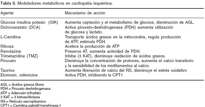 Existen varios agentes farmacológicos que disminuyen la oxidación de los ácidos grasos libres y aumentan la oxidación de la glucosa en el miocardio, con lo que se logra una mejoría en la producción de energía para la función contráctil del miocardio. En el miocardio isquémico hay una disminución del metabolismo aeróbico, situación que se complica con la restauración del flujo coronario y la revascularización coronaria que favorecen la formación de radicales libres.
