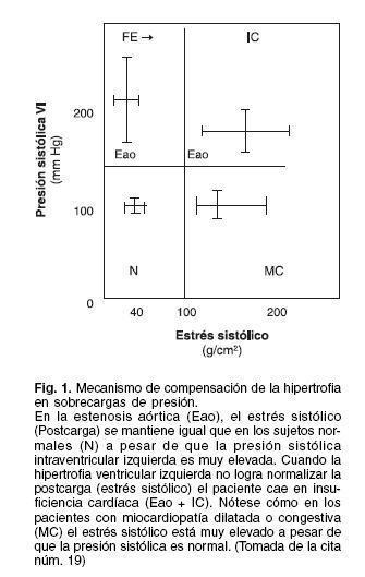 Cuando se analiza la función que cumple la hipertrofia en la fisiología del corazón adulto, se puede concluir que es un mecanismo que aparece como consecuencia de los procesos de remodelación ventricular17 para normalizar el estrés sistólico en las sobrecargas de presión (hipertensión arterial y estenosis aórtica)18,19 (Fig. 1) y el estrés diastólico en las sobrecargas de volumen (insuficiencia aórtica)20 (Tabla I).