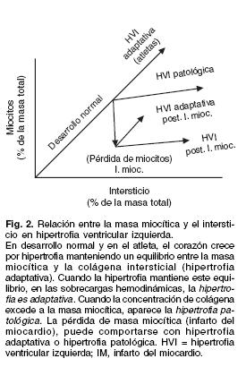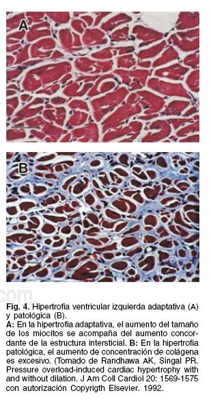 Vale la pena enfatizar que tanto en las sobrecargas de presión como en los de volumen, el aumento del crecimiento miocítico se acompaña de un crecimiento intersticial concordante (Fig. 2), lo cual ofrece un soporte estructural a la hipertrofia. Este crecimiento congruente entre la masa miocítica y la colágena intersticial, permite al corazón aumentar la función para enfrentar la sobrecarga, con la característica fundamental de no activar el sistema neuroendocrino. De esta manera, la hipertrofia miocárdica se puede considerar como un eficiente mecanismo de compensación para el corazón,23 el cual le permite por un lado mantener una función normal sin aumentar el consumo de oxígeno miocárdico (MVO2),21 a pesar del aumento de la fuerza contráctil que provee la hipertrofia compensadora (Fig. 3) y todo ello se lleva a cabo sin estimular mecanismos neuro-humorales. En estas condiciones, a la hipertrofia se le denomina <<hipertrofia adecuada>>.24