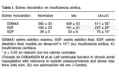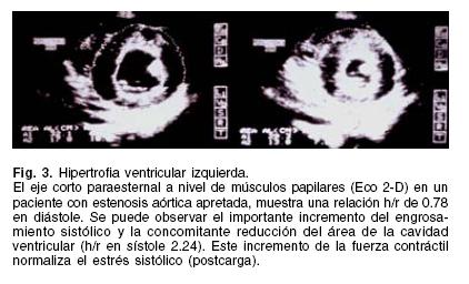 La diferencia entre la hipertrofia compensadora de la insuficiencia aórtica,22 en relación con la estenosis aórtica e hipertensión arterial,18,19 es que, en la primera, la hipertrofia adecuada se manifiesta por una relación grosor/radio en diastole con valores normales,22,25 mientras que en las sobrecargas de presión el grado de hipertrofia, que se requiere para normalizar la postcarga, es muy superior a los valores normales (0.70 ± 0.16 para la hipertensión arterial y 0.97 ± 0.27 para estenosis aórtica), por lo que cae en la categoría de hipertrofia inapropiada.18,19,24